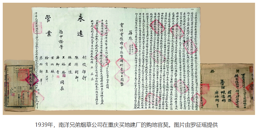 1939年5月,南洋兄弟烟草公司以4100元法币购得重庆一片土地,当时的四川省政府于7月核发此契。纸张虽已陈旧,字迹也已模糊,但它却像一把钥匙,打开了一段烽烟弥漫却坚韧不屈的岁月。